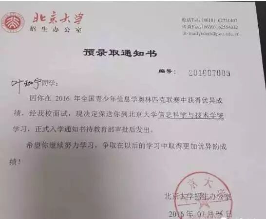 果不其然,北大在葉珈寧高一時就相中了他,與他簽約,表示可以降200分錄取他。高二時葉珈寧參加第33屆全國信息學奧賽,取得全國第14名的好成績,獲得北京大學保送資格。“一般來說,全國前50名的孩子,北大清華是任選的。”俞浚說。